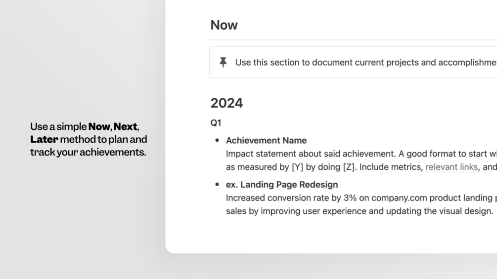 Build a professional (or personal) roadmap of where you are and where you're headed with this Achievement Journal template for Notion. This easy-to-use template applies the Now, Next, Later roadmapping framework.