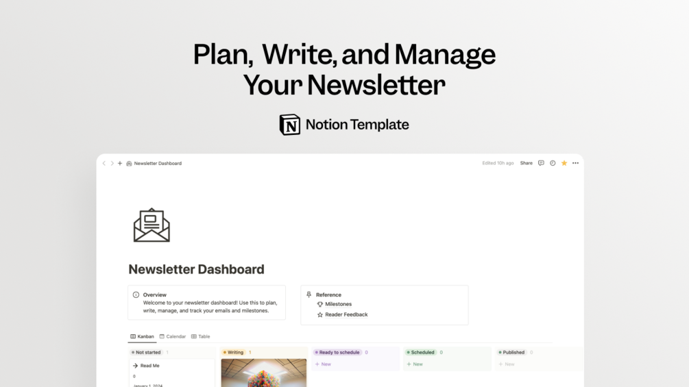 A Notion template designed to help you plan, write, and manage your newsletter.